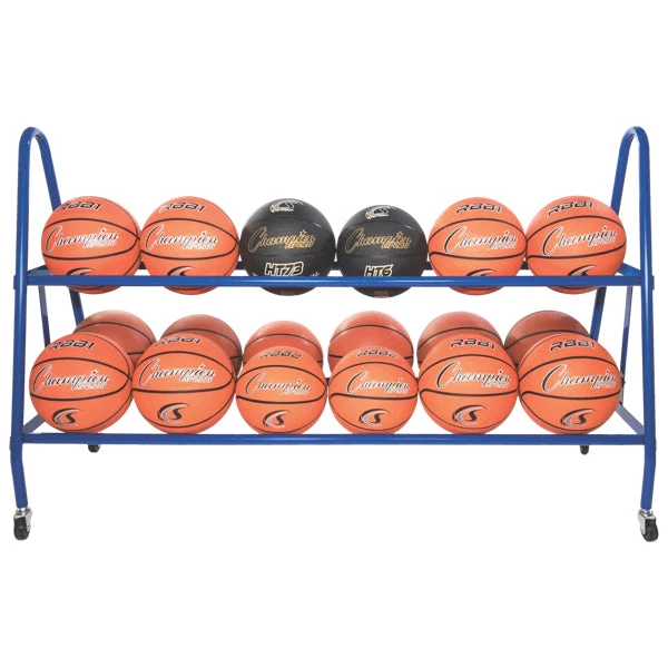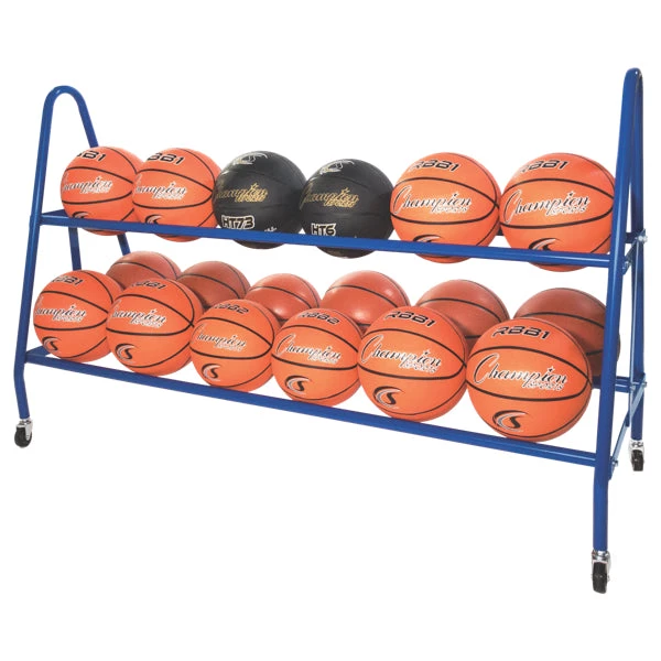 The Champion Sports 18 Ball Deluxe Heavy- Duty cart helps keep basketballs and playing balls in position or out of the way during games and practices. This cart has four swivel casters that make it easy to move in and out of storage. The wide base keeps your cart from turning over. This two-shelf cart holds 18 balls.