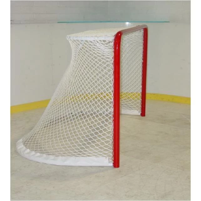 Great for highest level adult play -Rinks, leagues, schools, YMCA, etc. Frame opening measures 72”W x 48”H and has a 40” base depth and a 19” top shelf. The wide radius base flares out, it’s not just ‘rounded’. Uprights and crossbar are constructed of high quality 2” OD .109” thick galvanized steel. Front frame is powder coated red for a durable long lasting finish. Frame has a full perimeter welded lacing z bar -no lacing around goal face or base is needed. Locked frame is tightly bolted together with grade 8 bolts. Includes a custom trimmed NHL netting for easy installation. 6 mm thick white netting is durable UV treated knotless nylon with a 11/2” mesh size. Base skirt is included. Some assembly needed. Sold individually as a single goal.