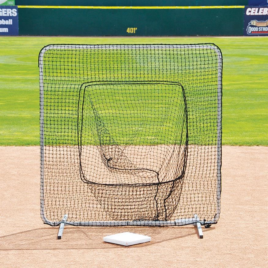Galvanized steel square frames with heavy-duty pillow-case style netting. Balls collect in sock for reuse.